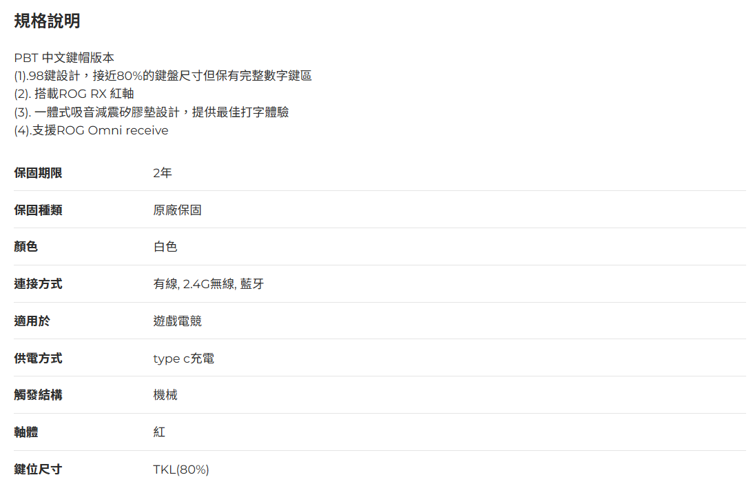 ● 98鍵設計,接近80%的鍵盤尺寸但保有完整數字鍵區● 一體式吸音減震矽膠墊設計,提供最佳打字體驗● 支援ROG Omni receiver