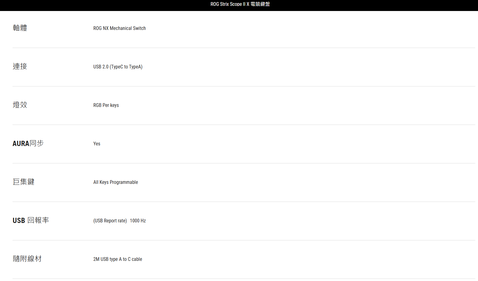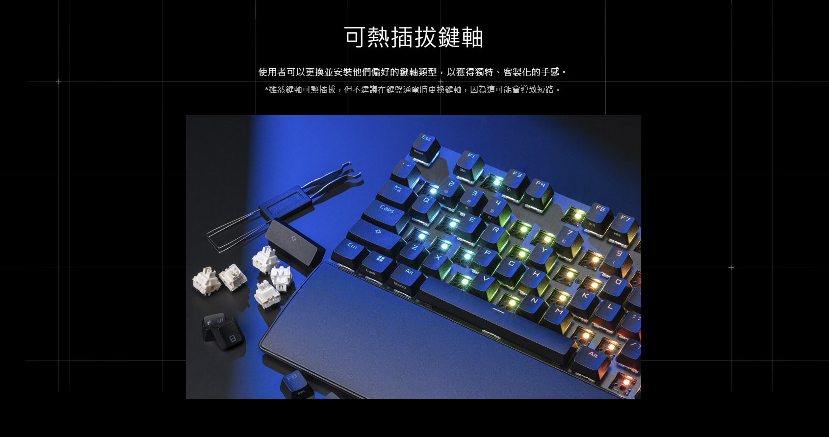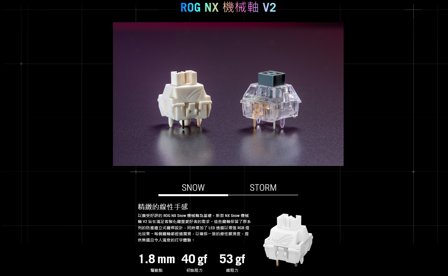 ● 可熱插拔 ROG NX Snow 機械軸 V2: 支援更多鍵帽類型,並提供更輕柔的敲擊聲與更精緻的打字手感