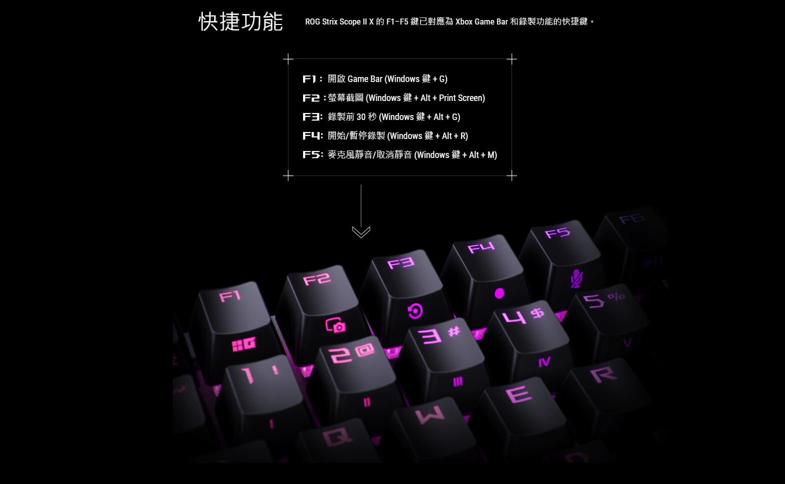 ● 快捷鍵: F1–F5 鍵已預先設定為適用於 Xbox Game Bar 和錄製功能的快捷鍵