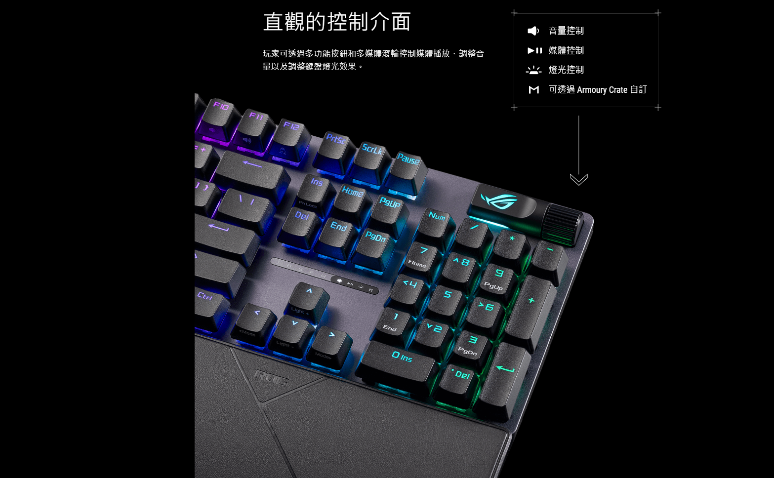 ● 直觀的控制介面: 多功能按鈕和多媒體滾輪可用於媒體播放、音量及鍵盤燈光效果