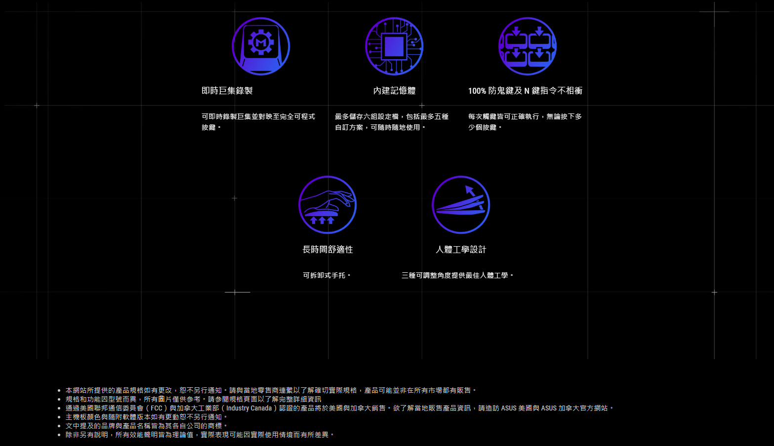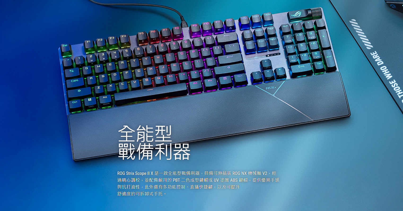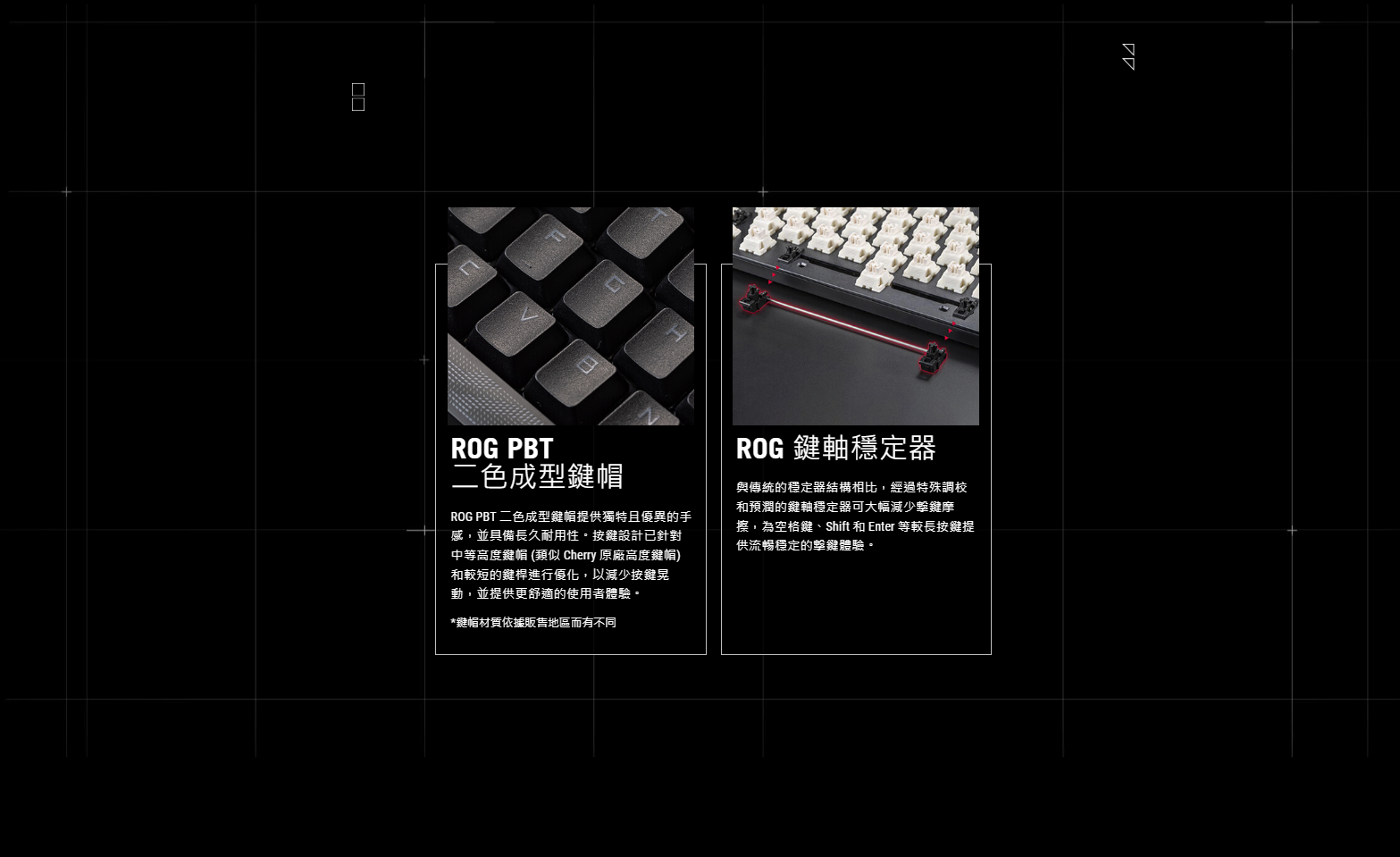 ● PBT 鍵帽:耐用的 ROG PBT 二色成型鍵帽提供優異的手感以及抗打油