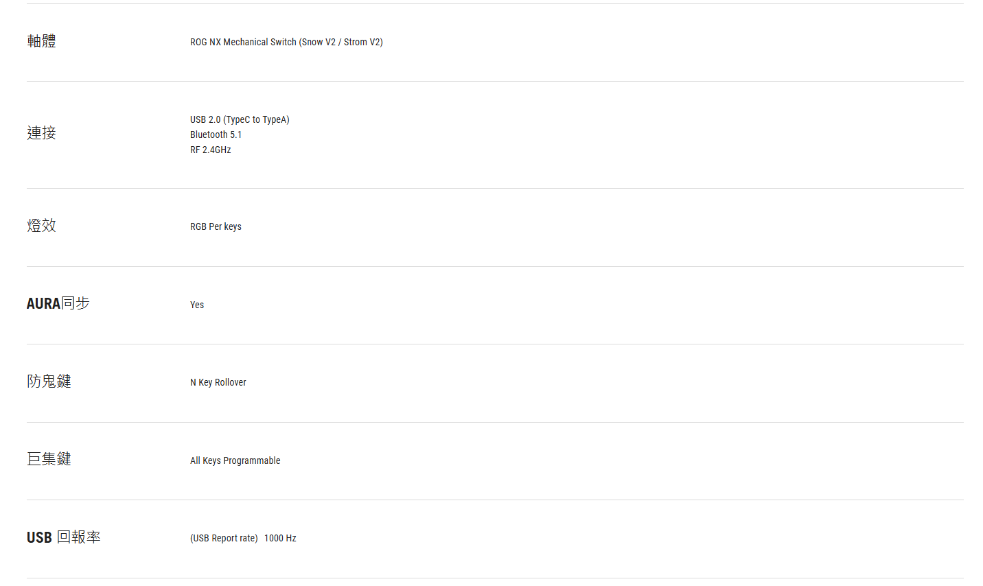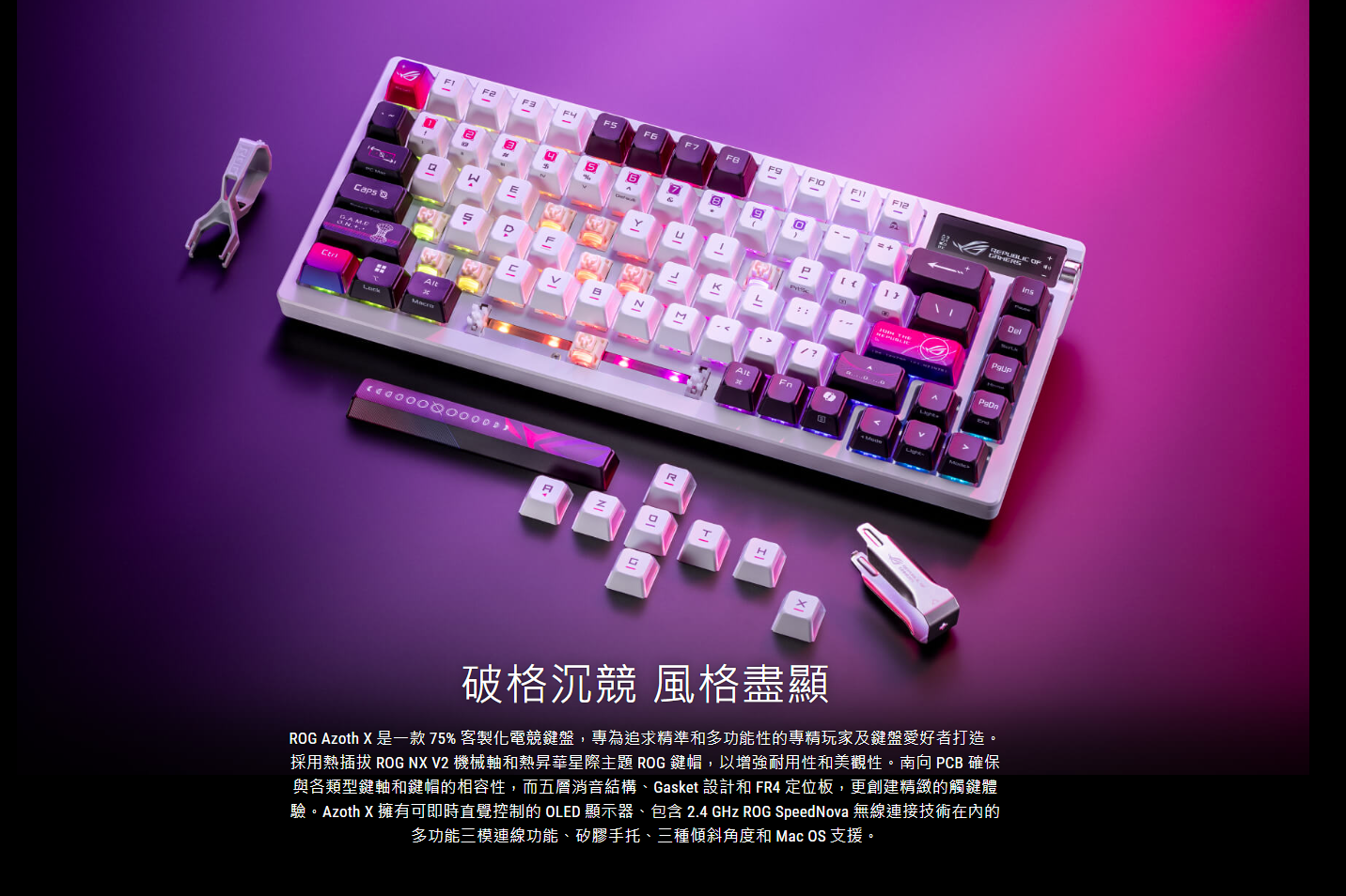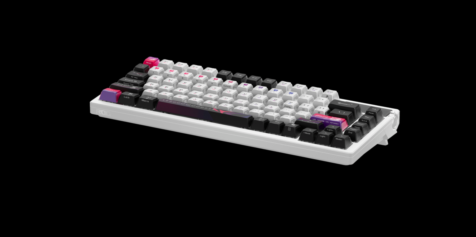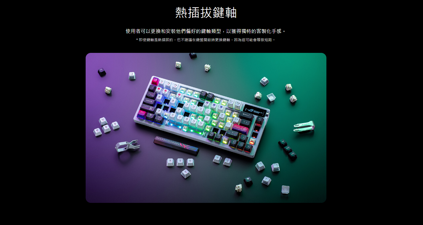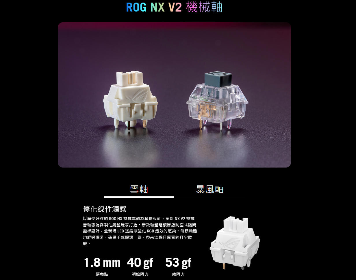 ● 熱插拔 ROG NX V2 機械軸: 支援更多鍵帽類型,提供更柔和的音效和更精緻的觸鍵手感。