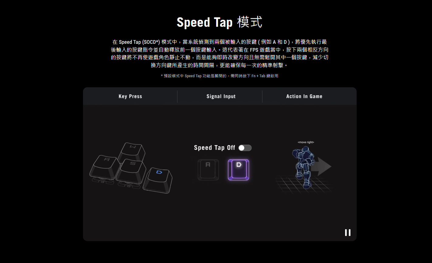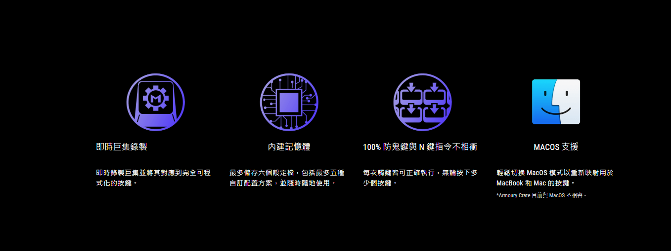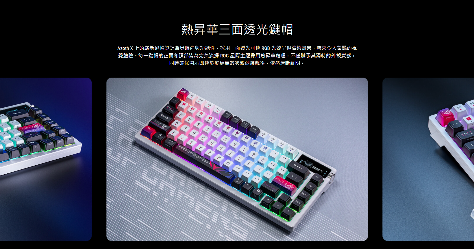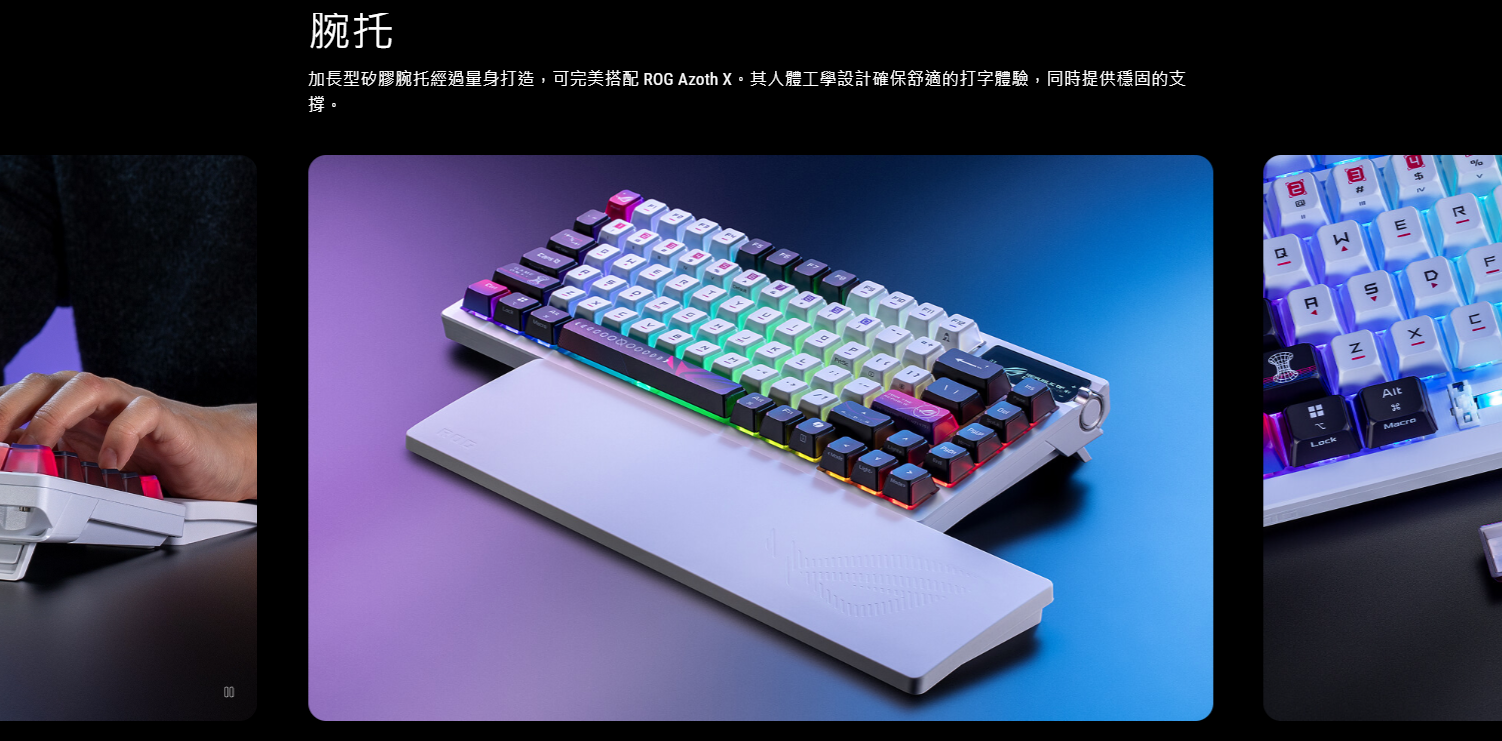 ● 星際主題 ROG 鍵帽: 特殊二色成型鍵帽為半透明設計,使 RGB 燈光可從三面透出,營造引人注目的美感。