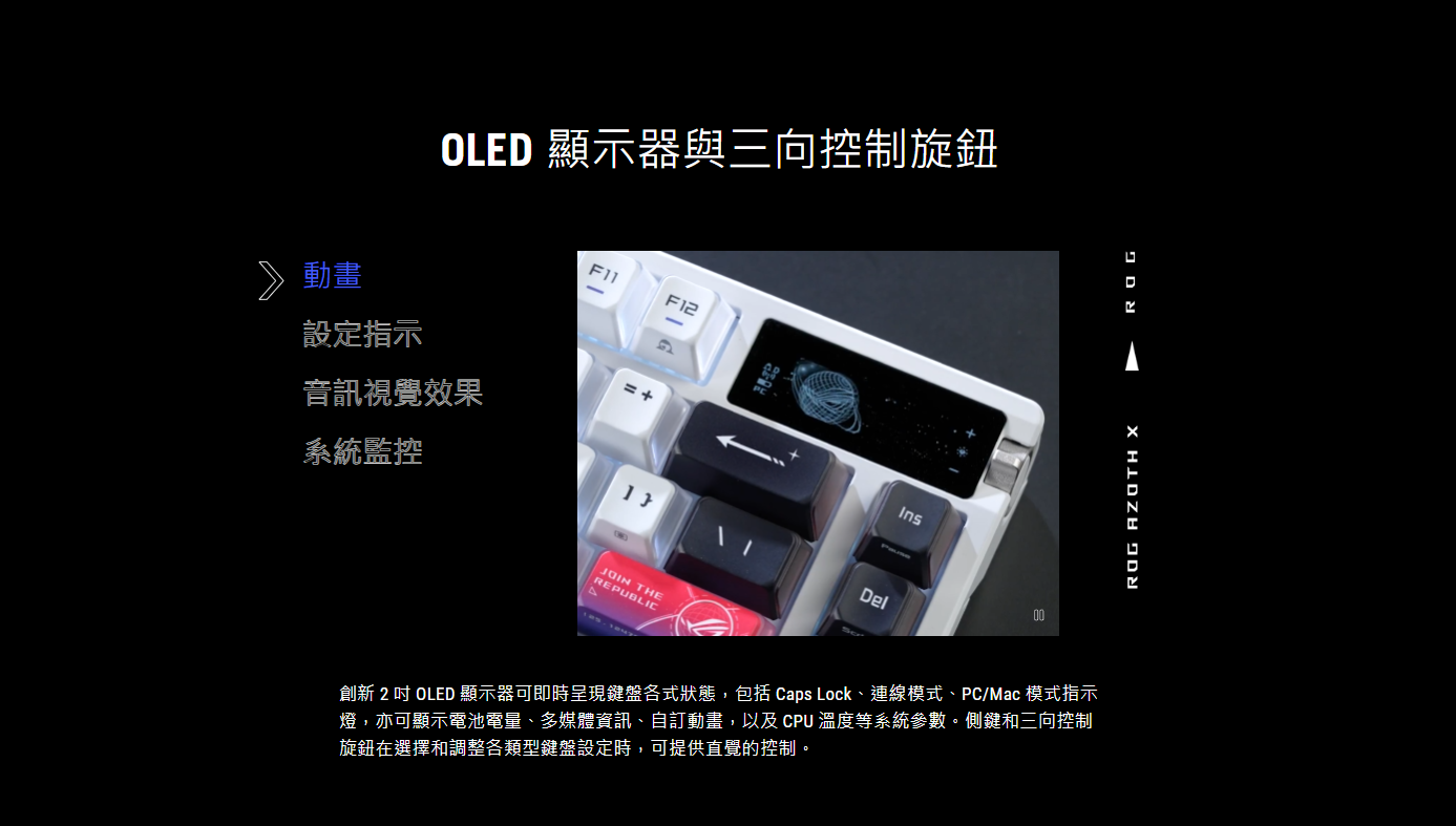 ● OLED 顯示器: 顯示系統資訊和各種設定指示燈,並配備三向控制旋鈕,可直觀調整各式鍵盤設定。