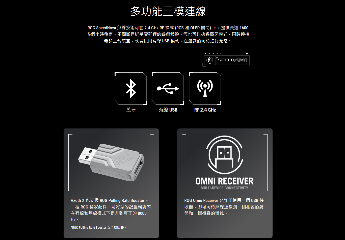 ● 三模連線: 可透過藍牙® (最多同時連接三個裝置)、具備 ROG SpeedNova 無線技術的 2.4 GHz 連線,或有線 USB 連線。