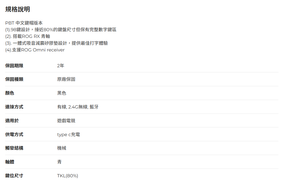 ● 98鍵設計,接近80%的鍵盤尺寸但保有完整數字鍵區● 一體式吸音減震矽膠墊設計,提供最佳打字體驗● 支援ROG Omni receiver