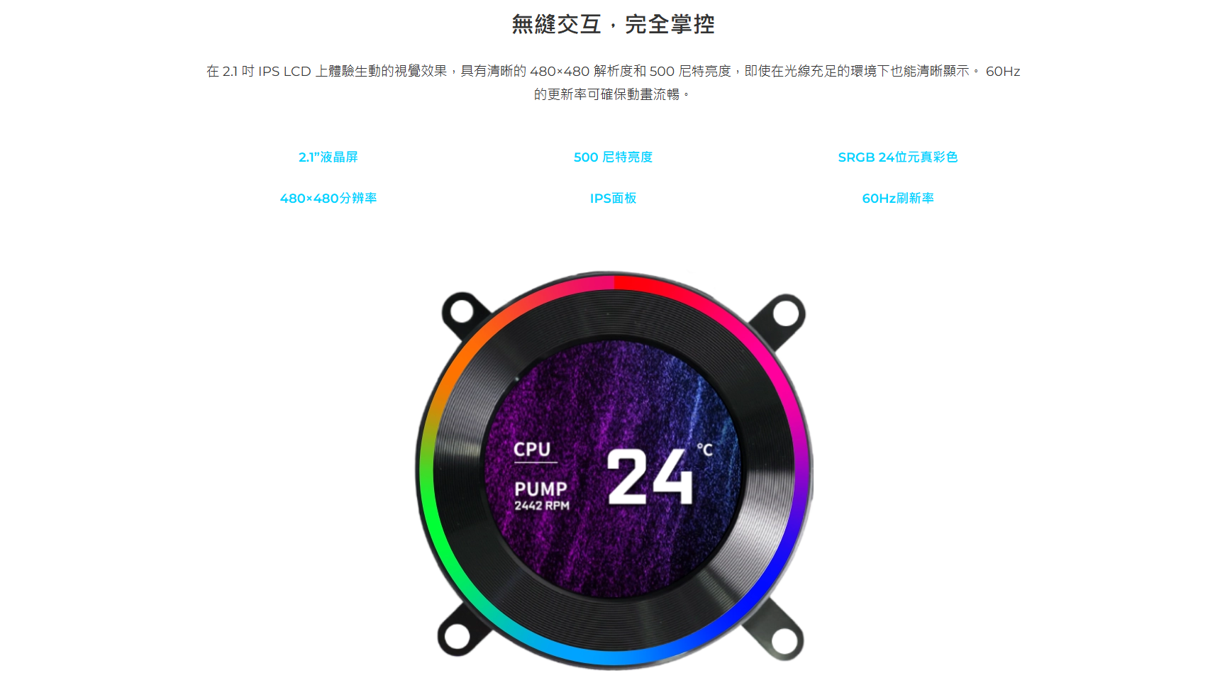 ● 配備 2.1 吋 IPS LCD,解析度為 480×480,亮度為 500 尼特,更新率為 60Hz。