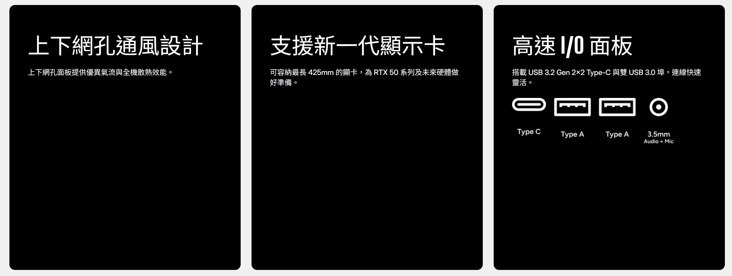 | 前置連接埠 | 1 x USB Type C 20Gbps, 2 x USB 3.0 |