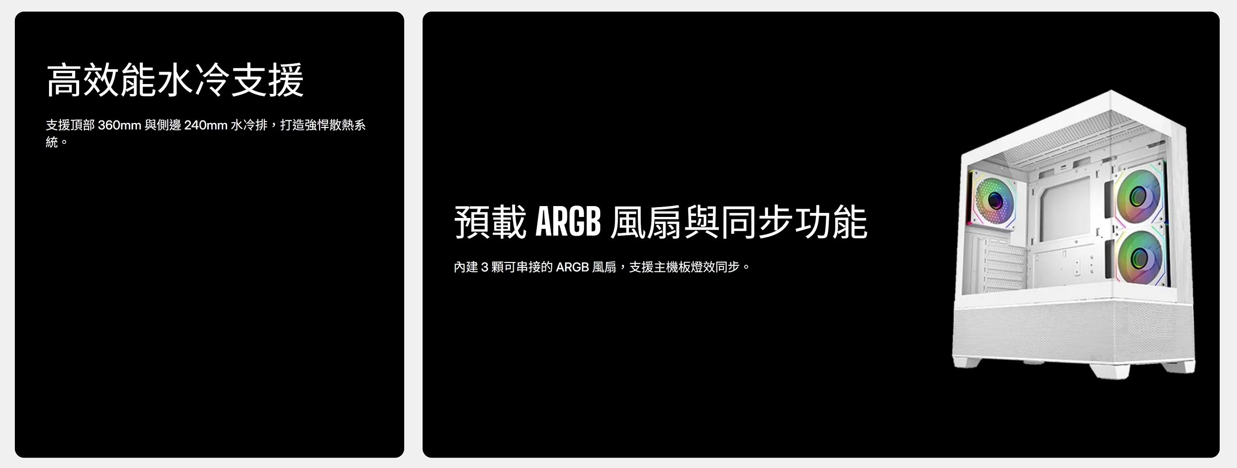 ● 支援頂部 360mm 與側邊 240mm 水冷排
