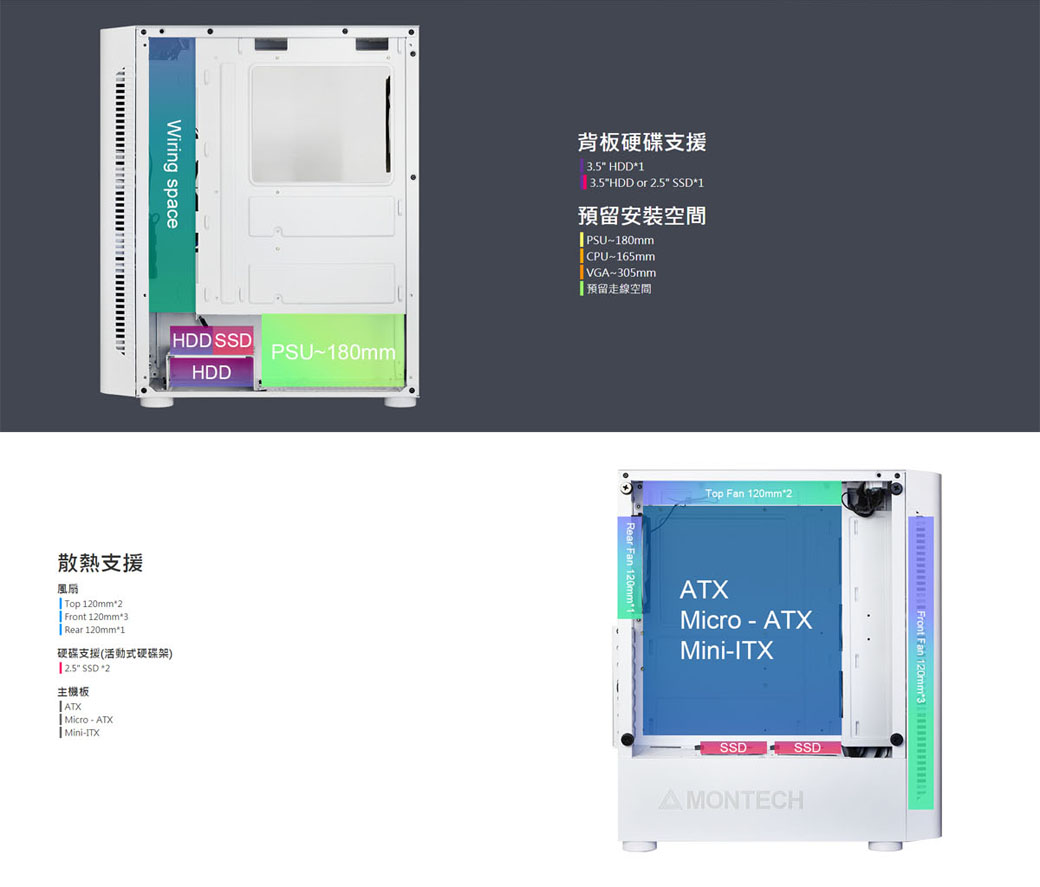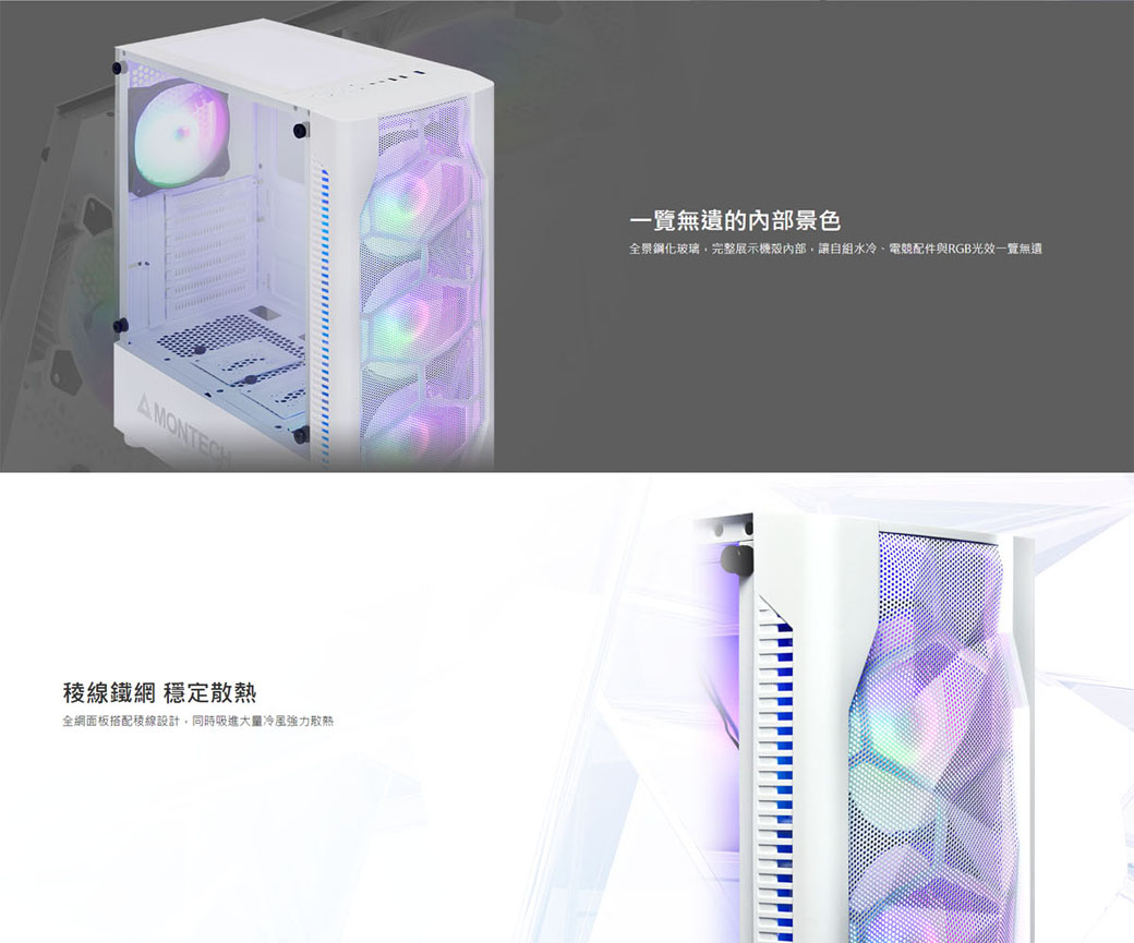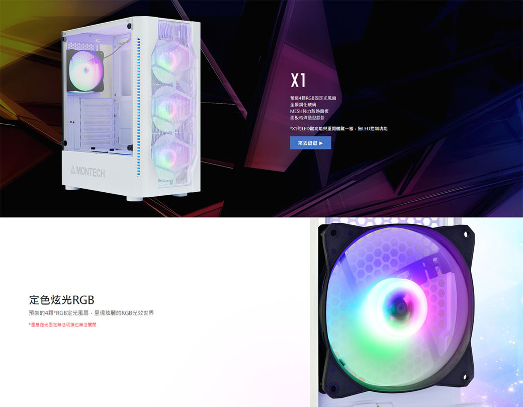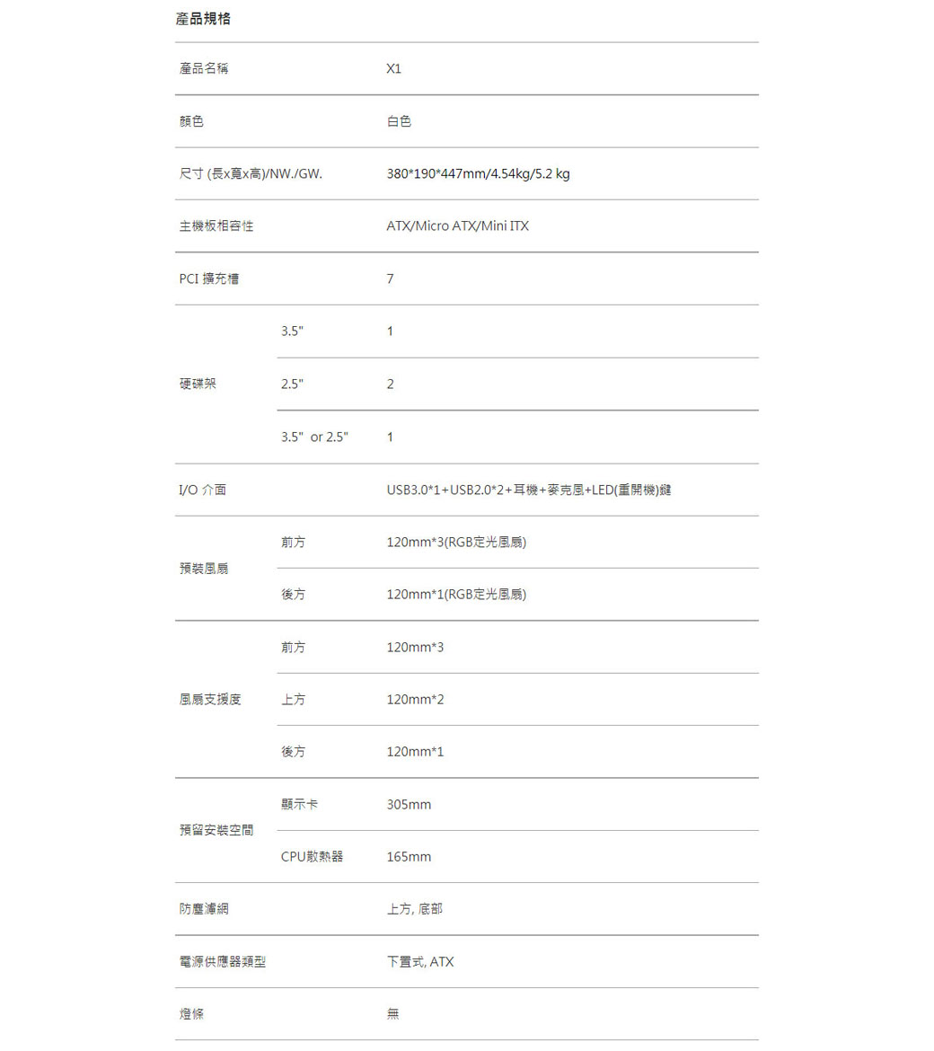 產品名稱:X1 顏色:白色 尺寸 (長x寬x高):380*190*447mm 主機板相容性:ATX/Micro ATX/Mini ITX PCI 擴充槽:7 硬碟架: 2.5"×3 3.5"×1 I/O 介面:USB3.0*1+USB2.0*2+耳機+麥克風 預裝風扇: 前方:120mm*3(RGB定光風扇) 後方:120mm*1(RGB定光風扇) 風扇支援度: 前方:120mm*3 後方:120mm*1 上方:120mm*2 預留安裝空間: 顯示卡:305mm CPU散熱器:165mm 防塵濾網:上方, 底部 電源供應器類型:下置式, ATX