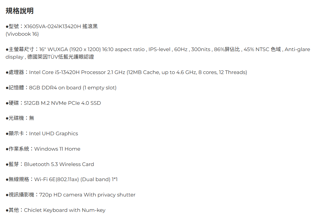 華碩 Vivobook i5-13420H/8G/512G/16吋 搖滾黑 X1605VA-0241K13420H 效能筆電