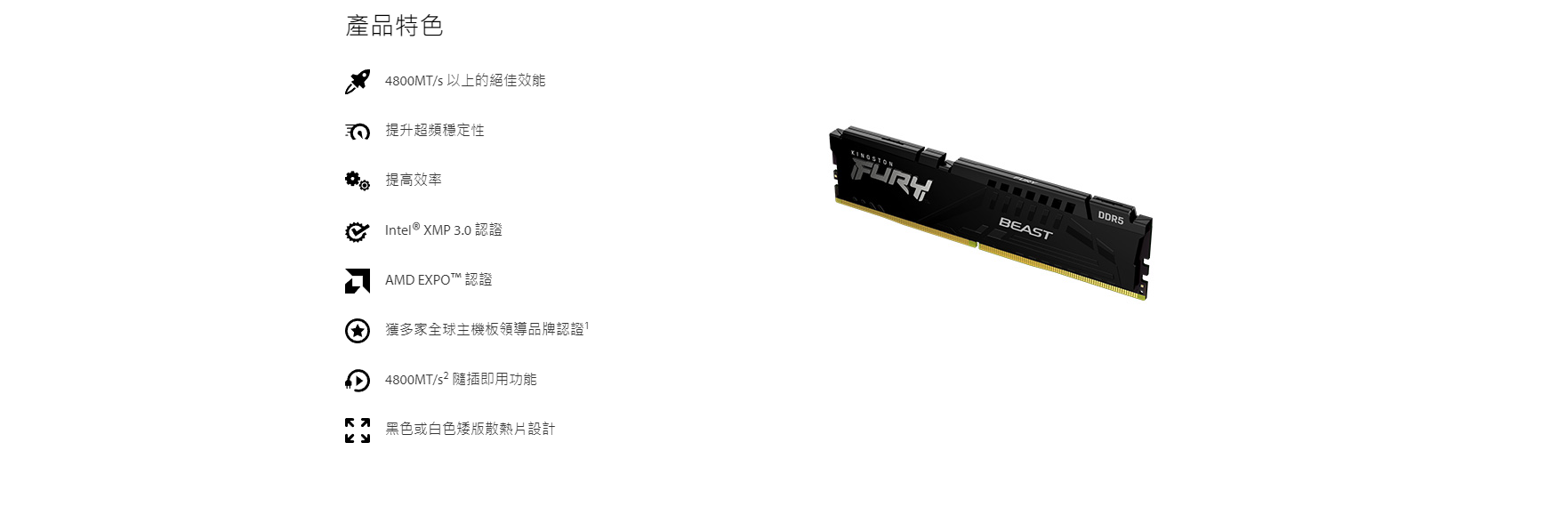 ● Kingston FURY Beast DDR5 提供 Intel® XMP 3.0 或 AMD EXPO™ 這兩種包括可自訂速度和時序設定檔的 DDR5 超頻規格選項,給您相容的超頻解決方案。