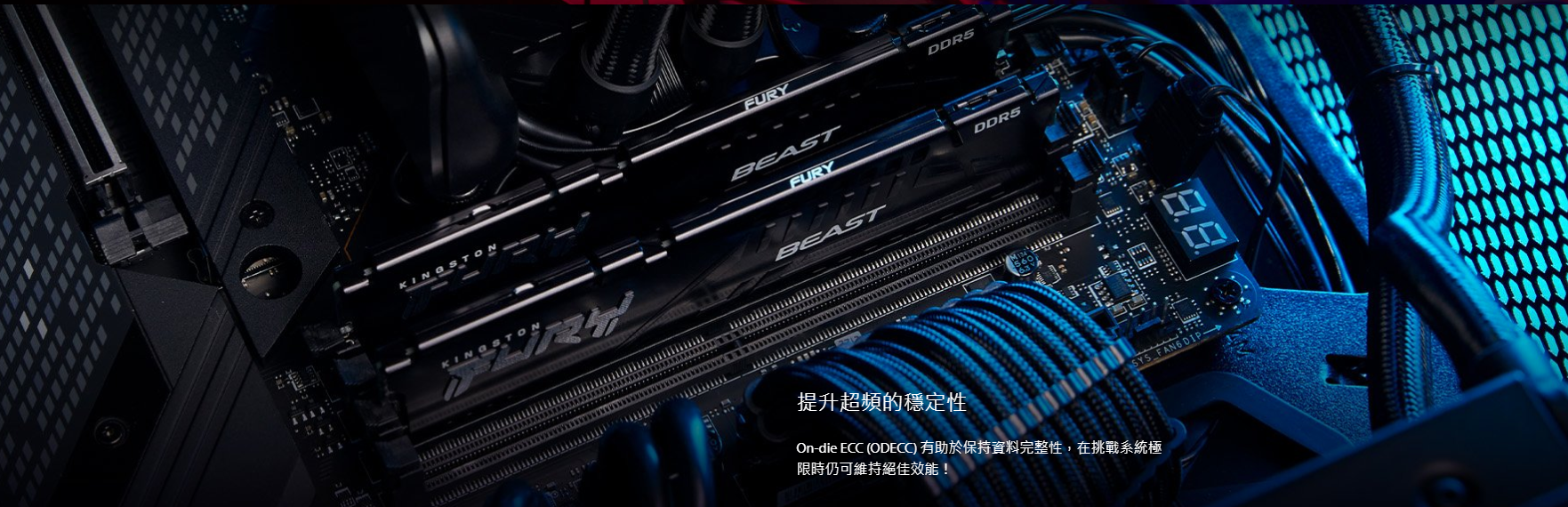 ● Kingston FURY™ Beast DDR5 以最前端的記憶體技術,為新一代遊戲平台帶來極致效能。DDR5 具備一系列強化功能,在速度、儲存容量和可靠性方面皆更上一層樓。例如 On-Die ECC (ODECC) 可增加在高速運作下的穩定性、兩個 32-bit 子通道可提升效率,而板載 電源管理晶片 (PMIC) 則可進行調節供電。
