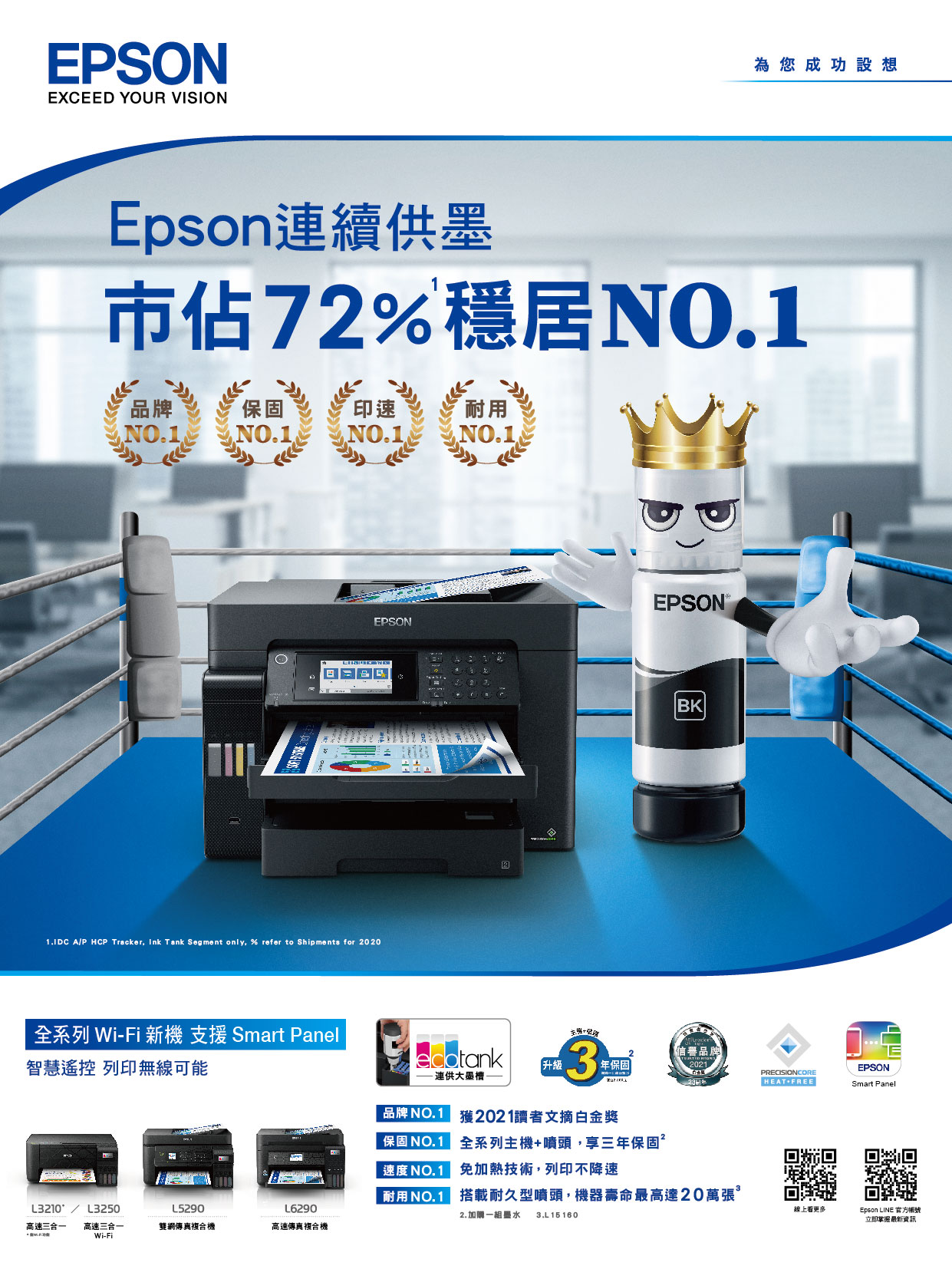 ● 安心:加購一組墨水升級2年保固,另有代用機服務