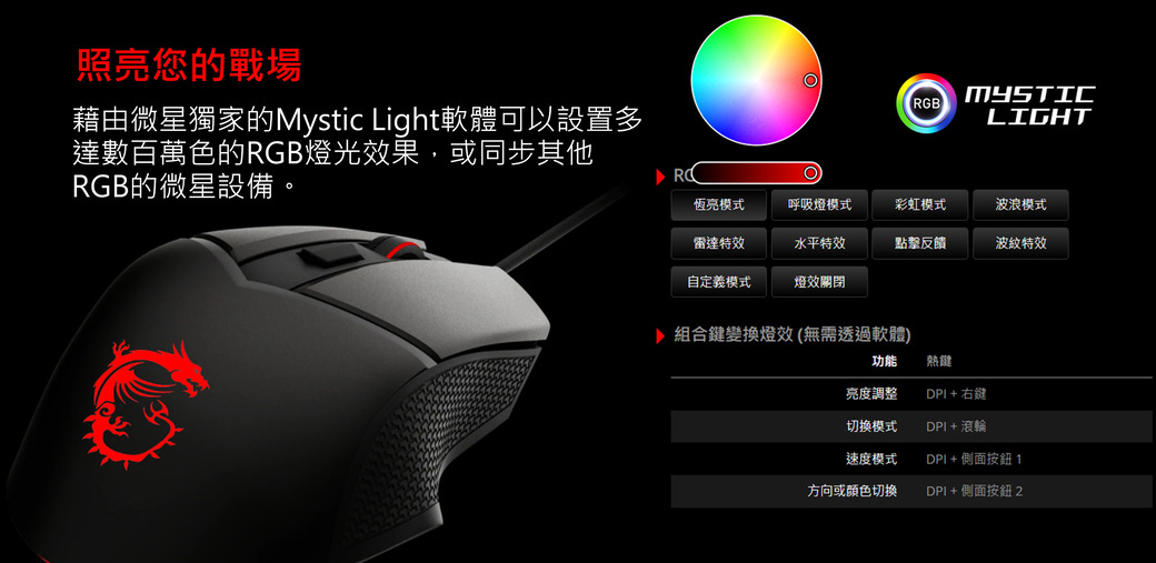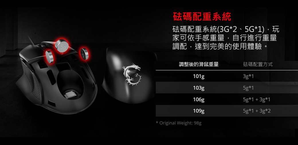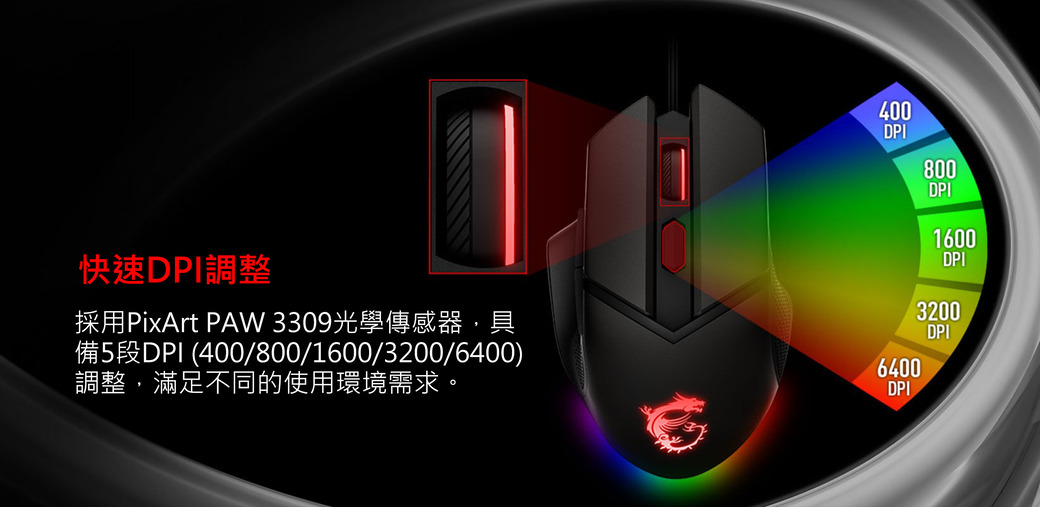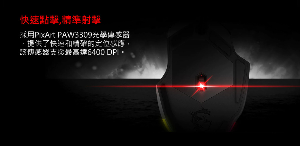 ★ PixArt PAW 3309光學傳感器★ RGB燈效設計★ 可調式配重系統(3G*2、5G*1)★ 5段DPI調整(最高達6400 DPI)★ 歐姆龍(OMRON)開關