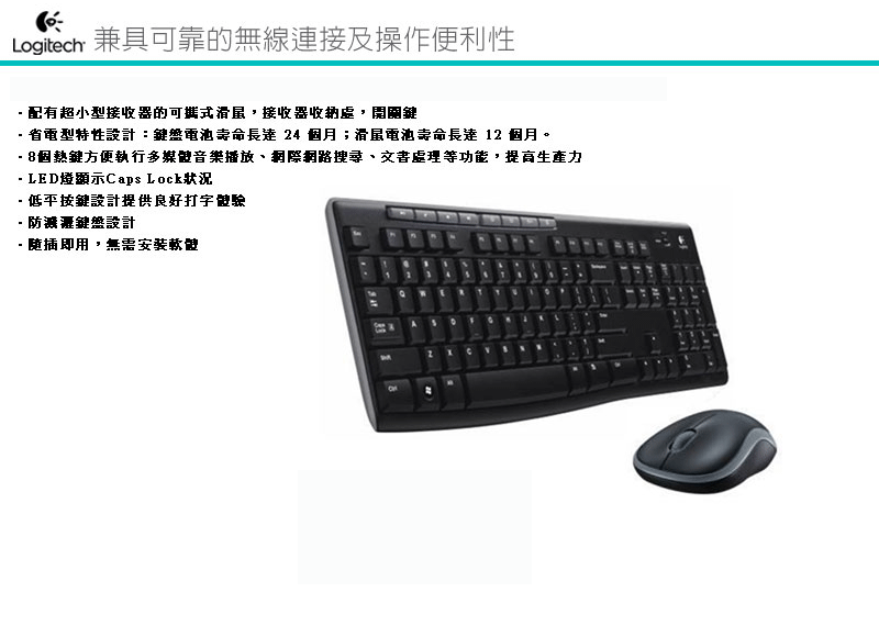 2 個 4 號 AAA (鍵盤) 電池和 1 個 3 號 AA (滑鼠) 電池 (已預先安裝)
