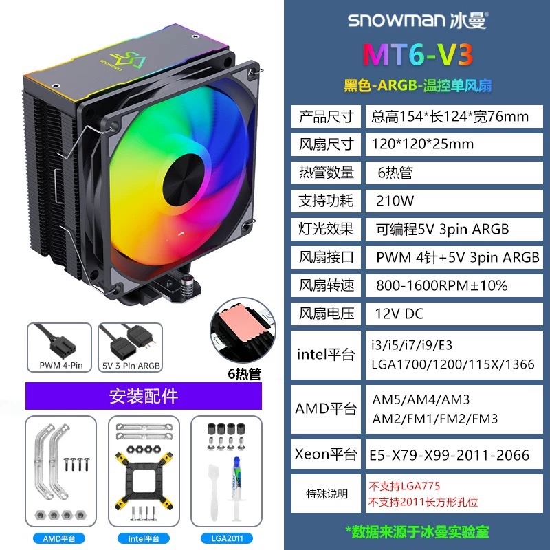 冰曼 MT6-V3-黑色-ARGB-溫控單風扇【6銅管】散熱器