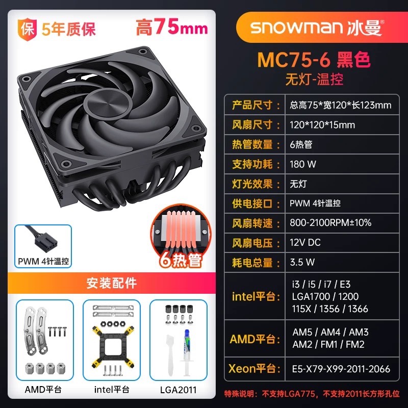 冰曼 MC75-6 黑色-無光【6熱管】散熱器