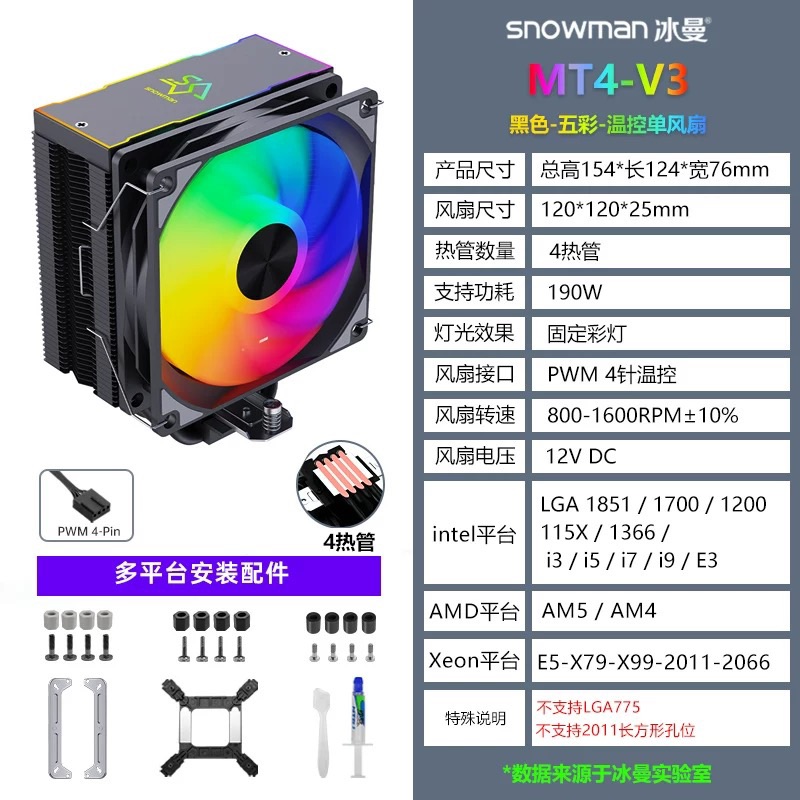 冰曼 MT4-V3-黑色 散熱器 溫控單風扇/4熱管/五彩